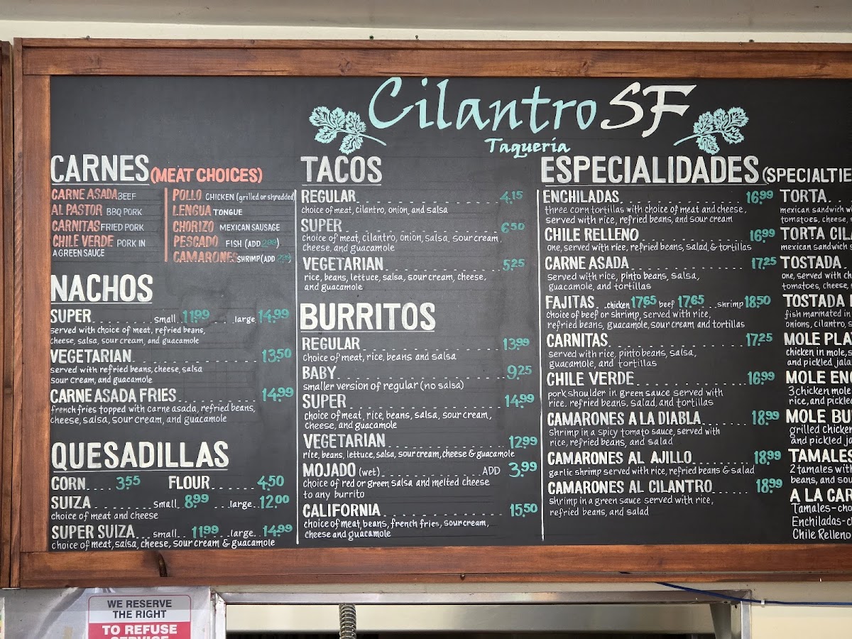 “ Great Mexican food, walking distance from Pier 39! If you’re looking for Mexican food, skip the place at the Pier, walk a little (around 15 minutes or so, maybe quicker if you speed walk) and go to Cilantro! I ordered a lengua burrito and it was great! My family ordered nachos and a carnitas plate and they liked them as well. ”